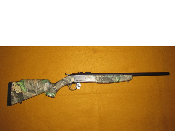Unique 'break open" single shot rifle in .243 caliber. Has camo synthetic stock, nearly new, 20" barrel.